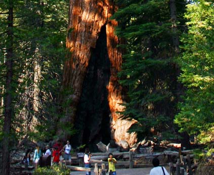 The "Grizzly Giant" Sequoia tree in Yosemite National Park. Giant Sequoias are the world's largest trees as measured by total volume and can grow up to 85 meters (280 feet) high and 8 meters (24 feet) in diameter. Based on tree ring count, the oldest known Giant Sequoia is about 3,500 years old.