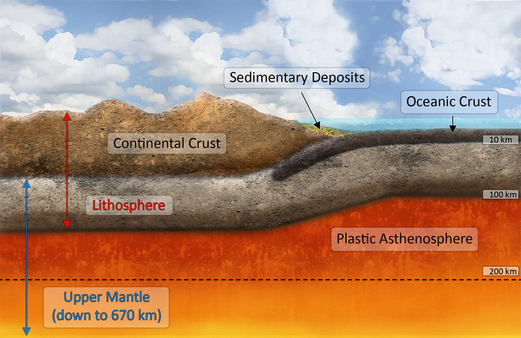 The theory of plate tectonics states that the upper surface of the Earth is broken up into a number of large chunks of rigid material, or plates, that are constantly in motion (see diagram to far right). These plates are composed of oceanic and/or continental crust, and the rigid upper part of the mantle. These two sections together make up the lithosphere which extends to a depth of approximately 100 kilometers (approximately 60 miles). These plates ride on top of the asthenosphere, a layer of flowing rock in the mantle. These plates, containing the oceans and the continents, act very much like large rafts floating on a liquid.