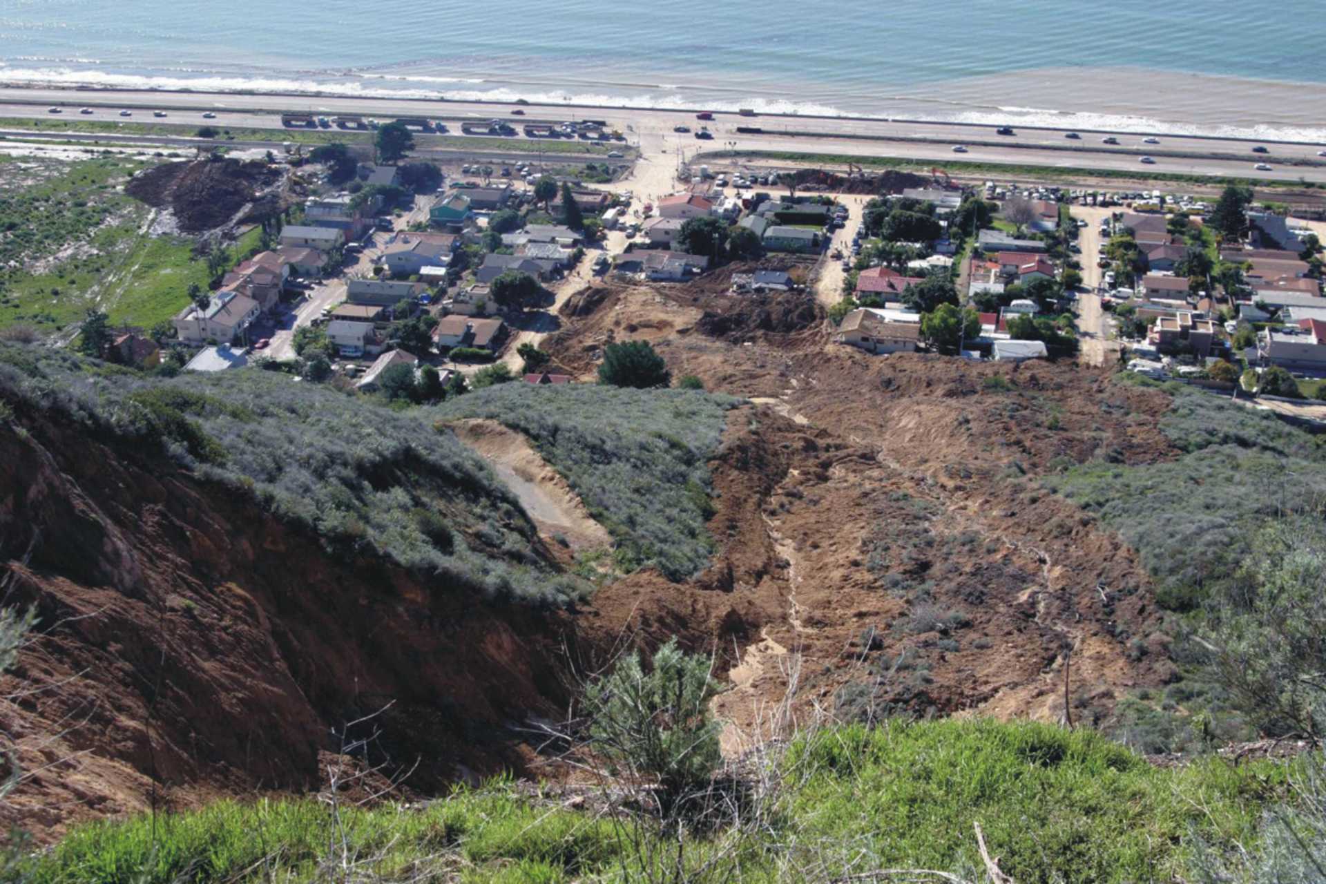 Heavy rainfall triggered this mass movement of soil on January 10, 2005 above the town of La Conchita, California.