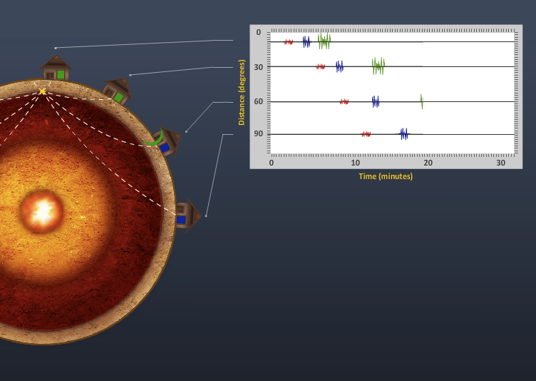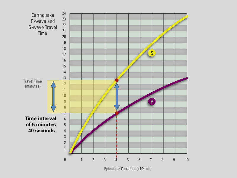 Geologists have used many careful observations to prepare a standardized travel-time graph for P and S waves. The difference between the arrival times of the P and S waves can be used on the travel-time graph to directly read the distance from the epicenter of the earthquake.