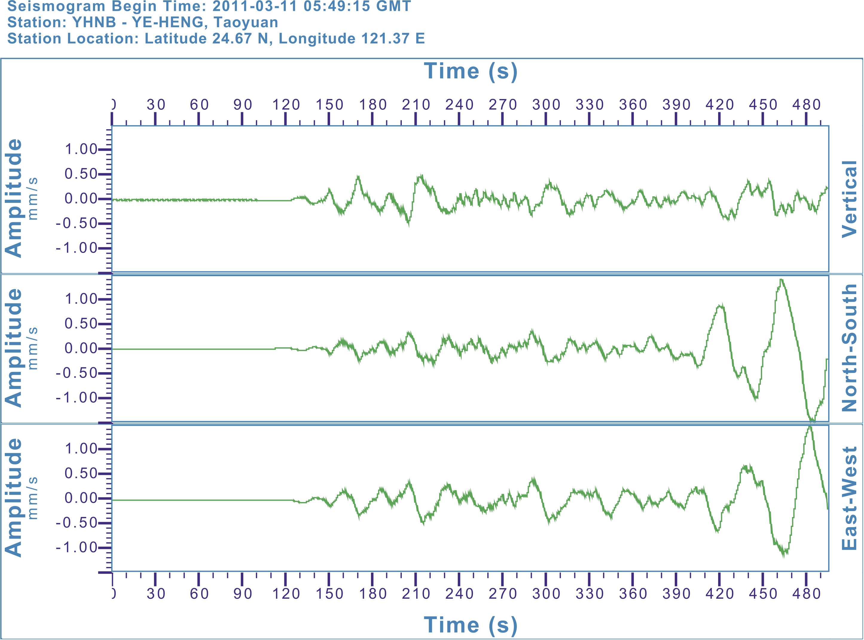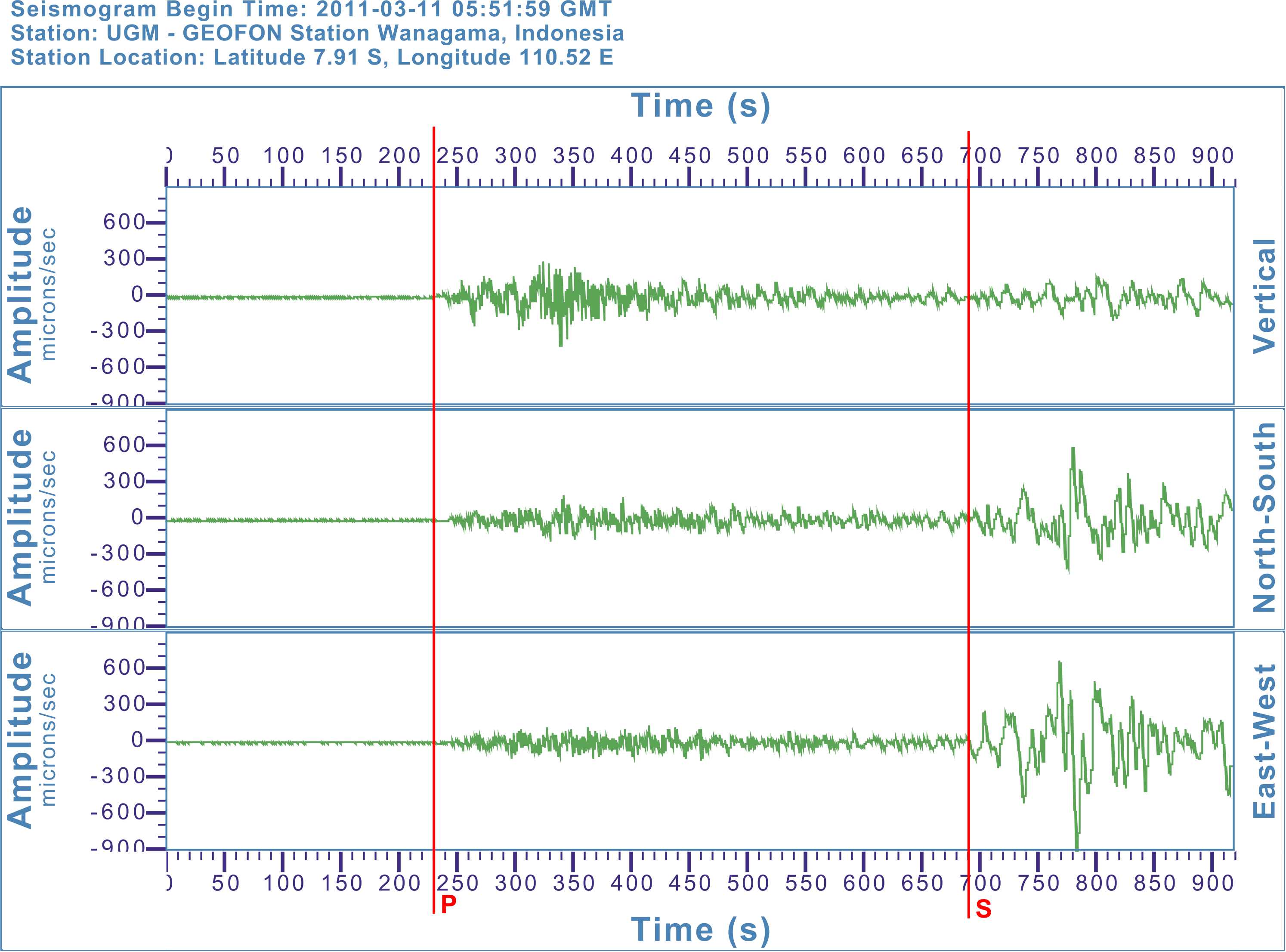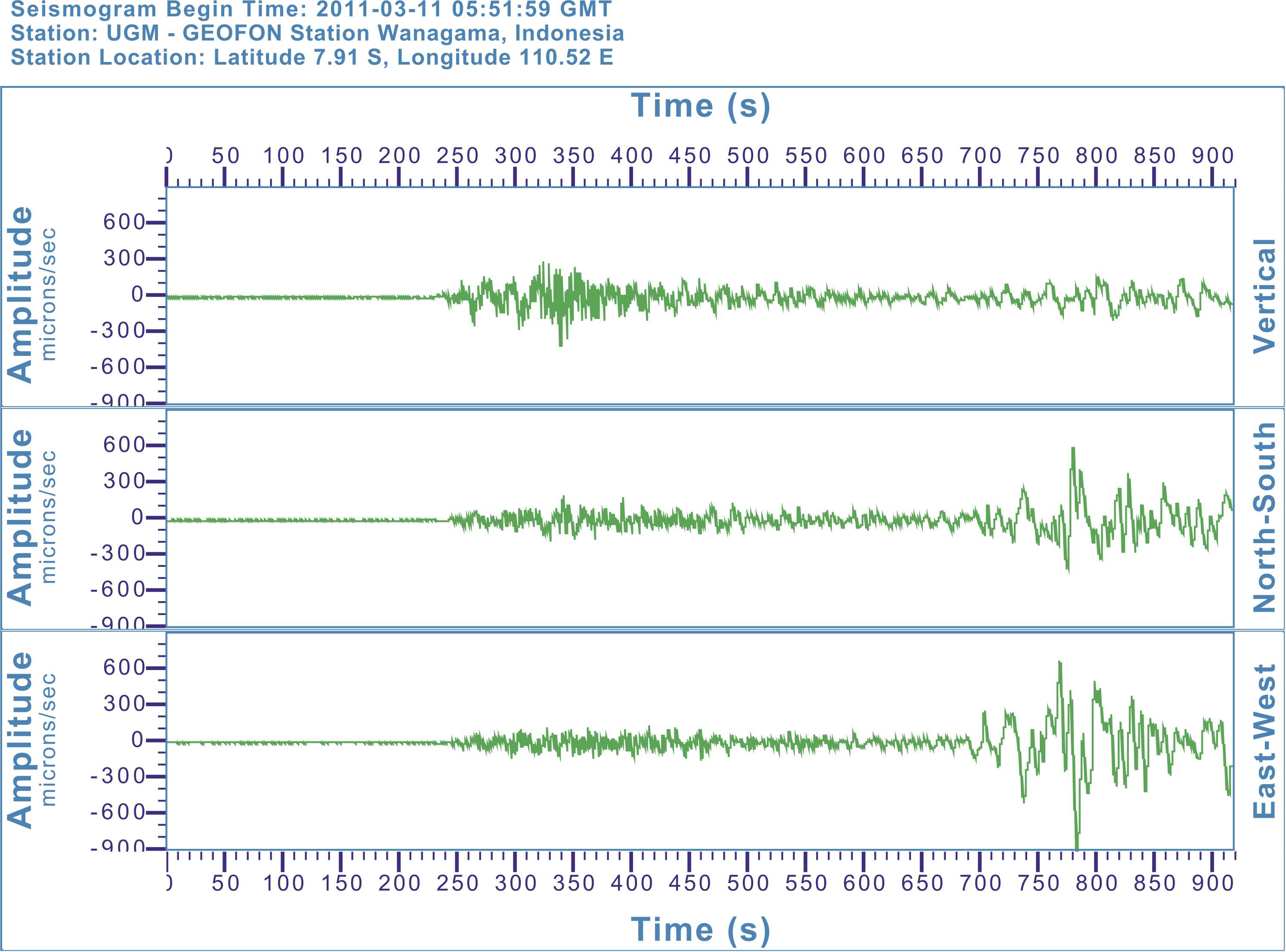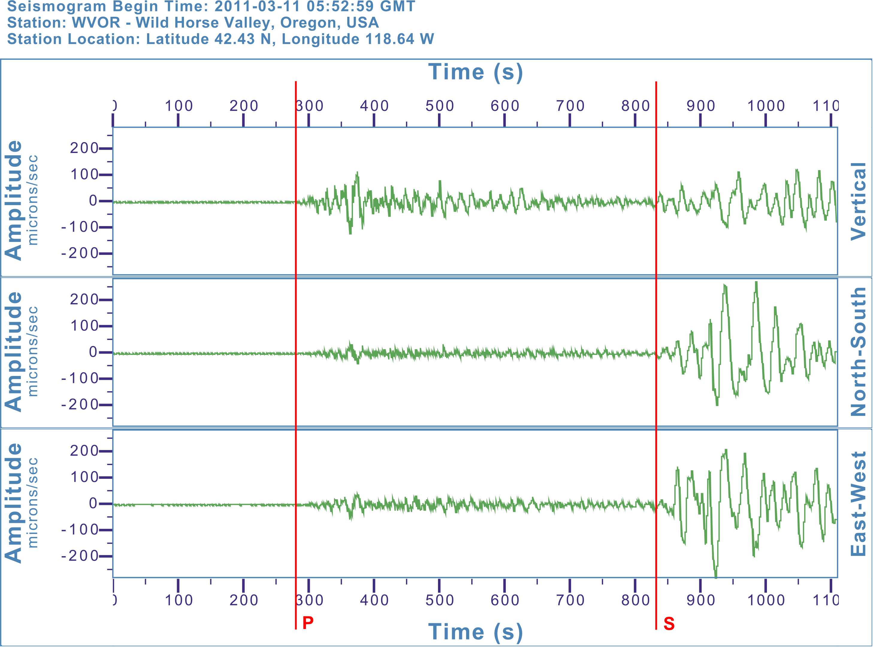 Seismic stations around the Pacific Rim recorded seismograms of the March 11, 2011 earthquake in Japan. The data from three seismic stations is presented below; Taoyuan in Taiwan, Wanagama in Indonesia, and the Wild Horse Valley in Oregon, USA.